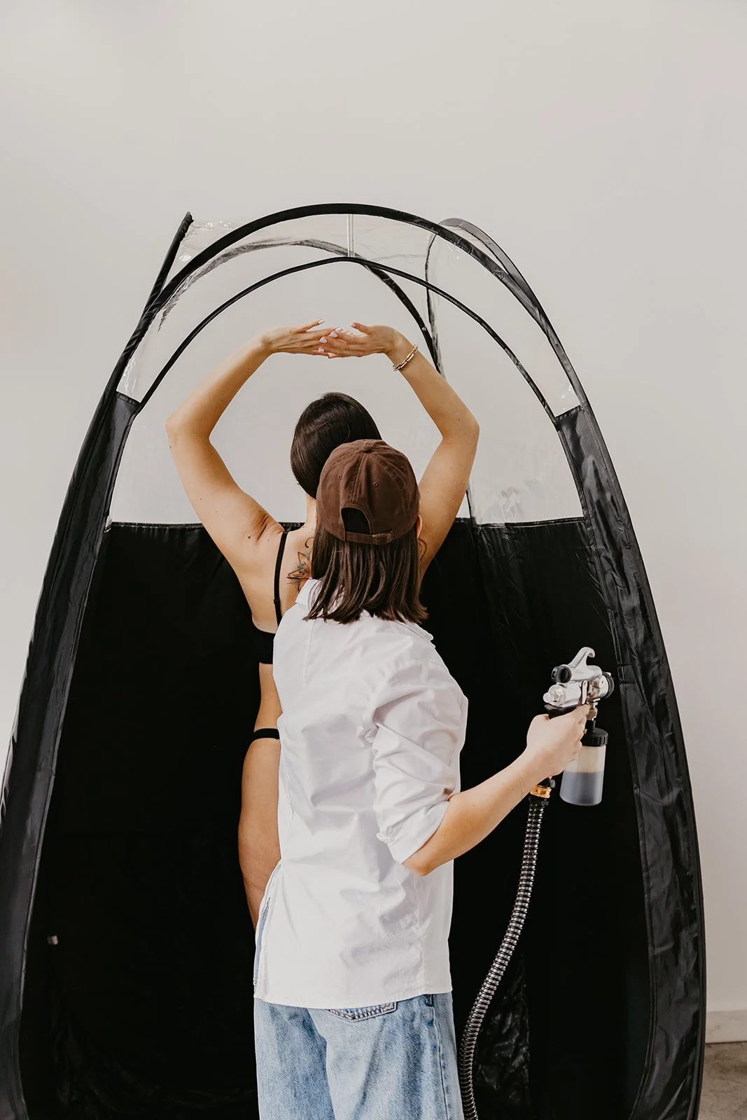 Arrive in the undergarmets you plan on wearing for your spray tan. You also have the option to remove all undergarmets to ensure your full body is glowing - whatever makes you most comfortable in the studio.